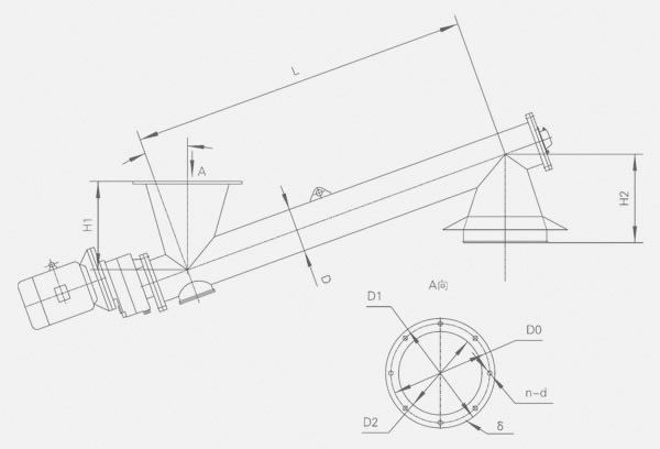 注:1.输送倾角α=10°~ 20°;2.结构尺寸、料口形式及尺寸可根据工艺要求变更。