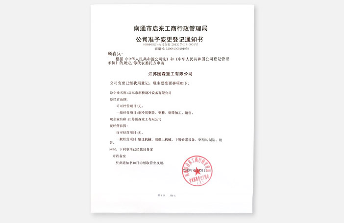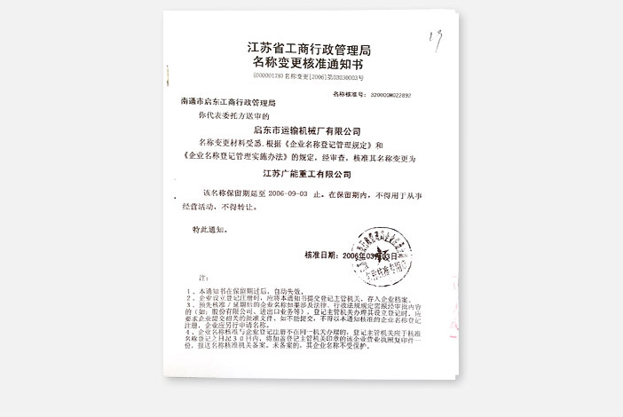 | 2006年3月3日 为公司“广能”牌输送机械产品品牌发展战略需要,经江苏省工商行政管理局核准同意,启东市运输机械厂有限公司更名为:江苏广能重工有限公司 |