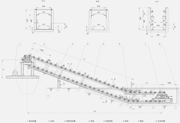 一条刮渣机可以有水平段和倾斜段变角度输送,倾斜段的倾角可达40°。