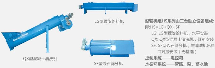 HS.LG型螺旋输送机可同时将4台以下搅拌车倾倒于内的混凝土残料输送到HS.QX型清洗机料斗内,并向清洗机料斗内注入清水和循环水,以稀释混凝土残料。特殊设计的清洗机螺旋体连续旋转将骨料沿机壳斜槽提升,由于螺旋叶片的搅动作用使骨料得到初步清洗;当被分离的骨料继续提升脱离液面后,设置于清洗机上部盖板上的两处注水口将清水直接喷射在运动中的骨料上,使骨料再次和第三次被清洗。继而砂石骨料被送至筛分机,筛分机将细砂与碎石分离。