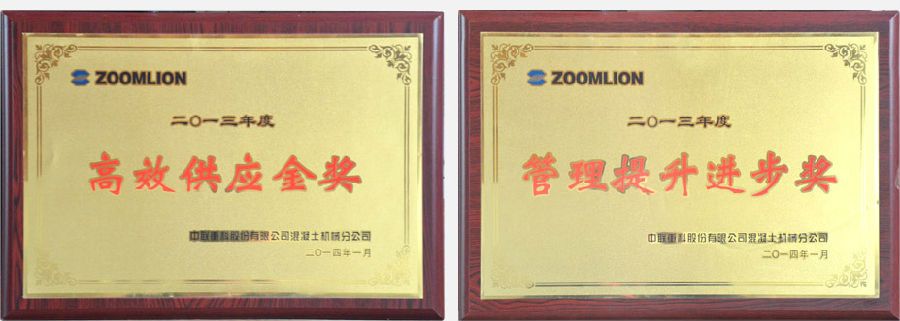 2014年1月15日,中联重科供应商年会在长沙召开,我公司作为中联重科重要供应商之一,被中联重科授予“高效供应金奖”和“管理提升进步奖”。